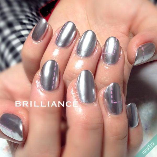 例えば、シルバーのミラーネイルにホワイトで太めのステッチアートを施すデザインはいかがでしょうか。鏡面仕上げのミラーネイルにステッチアートが程よいアクセントとなり、大人カジュアルでカッコいい仕上がりを楽しめますよ♪