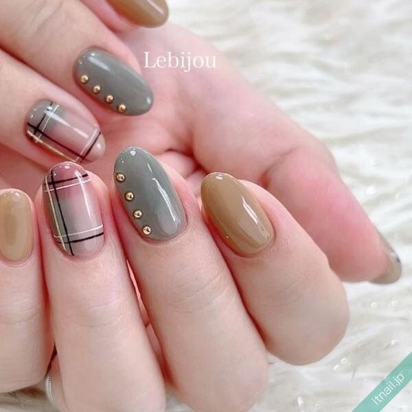 こちらは、ブルーグレーやベージュなどの中間色を組み合わせたデザイン。チェック柄のベースには、くすみピンクも使い、ちょっぴり秋を先取りできそうな色合わせのネイルです。縦に並べたゴールドスタッズが、ピリリとクールなテイストを加えていますね。