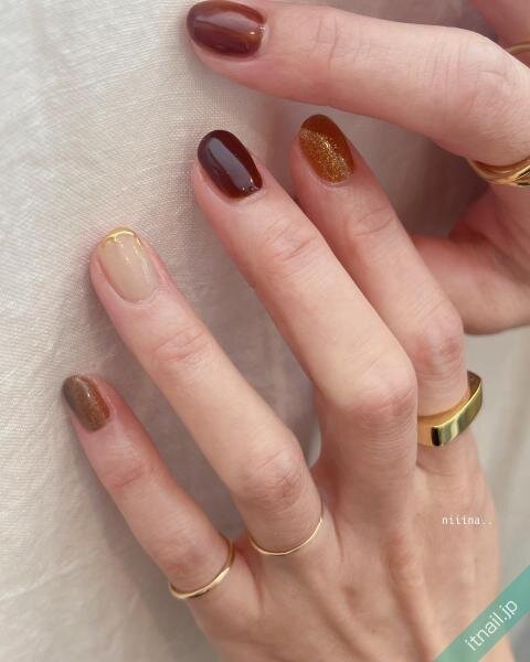 落ち着いた大人ネイルを楽しみたいときは、こっくりブラウンが多くなるように取り入れるのがおすすめです。ほんのりベージュを効かせたもやもやネイルがおしゃれ!ゴールドミラーの塗りかけネイルを爪の先端に入れて、エレガントな輝きも忘れずに♪