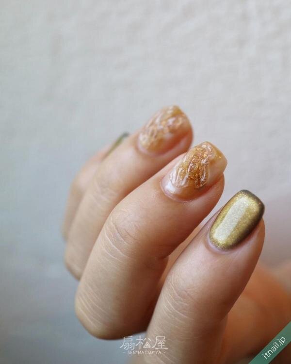 ゴールドベージュのニュアンスデザインは、特別感のあるきれいめネイルに。ラメの輝きやミラーの光沢感、艶めく透明感によって上品にゴージャスで素敵です。天然石のうるっと透け感がお洒落で、良い女性感漂う色っぽネイルになっています。