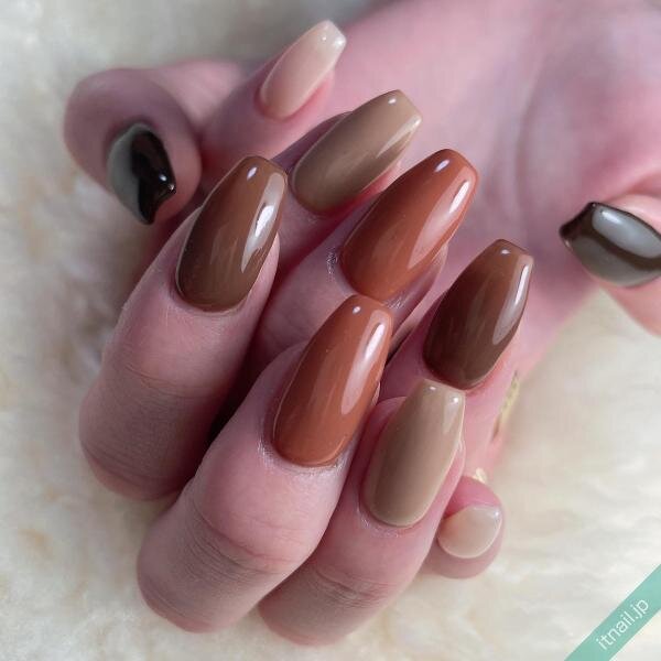 爪ごとにトープブラウンの色味を少しずつ変えて、指グラデーションのようなデザインを楽しむのもおすすめです。ブラウン系でまとめているので、こっくりした色で秋らしい指先にしたい方にぴったり!