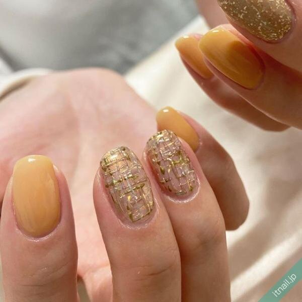 こちらは、オレンジやカーキ色といったアースカラーを組み合わせたデザイン。ブラウン系の濃淡で描いたツイード柄は、ザラリとした質感を感じさせますね。各爪にゴールドの立体的なラインやストーンを乗せ、ジュエリーのような高級感をプラスしています。カジュアルながらも、大人の雰囲気漂うネイルです。