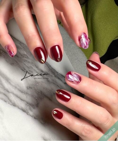 こちらは、この季節ならではの深いボルドーカラーを使ったデザイン。ボルドーとマゼンダを織りまぜた、華やかな天然石アートを組み合わせています。先端にはゴールドのミラーモチーフをちょこんと乗せています。ロングネイルにできない方にもオススメしたい、セクシーなムードが漂うネイルですよ。