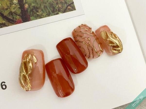 しっかり色づいたブラウンレッドには、メタリックネイルで作った軽やかなニュアンスネイルを合わせて質感の違いで遊ぶのが◎。女性らしい赤みのあるブラウンに、抜け感のあるデザインがよく似合います。ワイルドに3Dのジェルをポイントに置いたら、アクセサリーなしでも十分な存在感です。