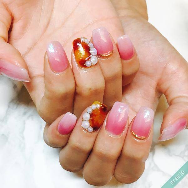 アメ色を基調とした、べっ甲ネイル。独特の艶感が美しいデザインですが、これにパールを1粒プラスすると、上品さと程よい華やかさを兼ね備えた、大人女子にふさわしいネイルデザインに仕上がります。