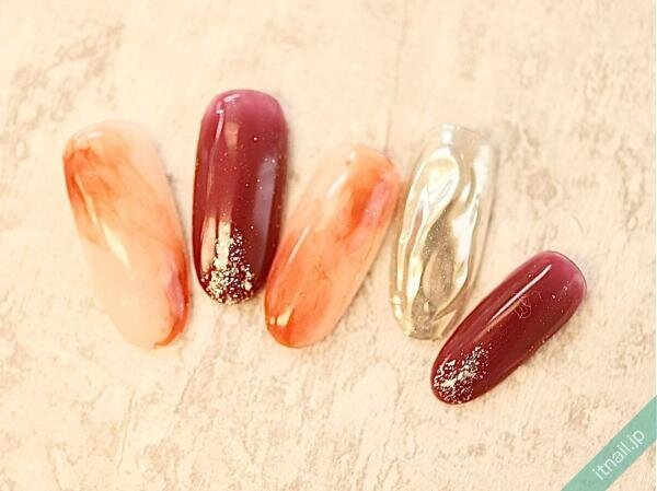 オレンジの天然石風デザインとミラーのうねうねデザインで今っぽく見せたら、そこへさらに深みレッドの差し色を加えていきます。一気にデザインが秋めくから、季節感あるネイルを楽しみたい方にぴったりですね♪爪先にはシルバーのラメを少しだけ飾り、華を添えたら完成です!