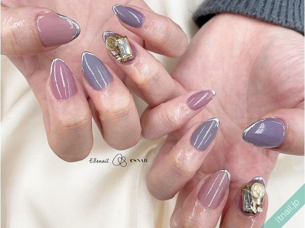 こちらは、スモーキーなピンクとパープルを組み合わせたデザイン。尖りぎみの先端には、シルバーミラーで細いフレンチラインを入れています。左右の薬指に、ビックビジューやゴールドのコインパーツを乗せ、シックでありながらラグジュアリーなムードを漂わせていますね。