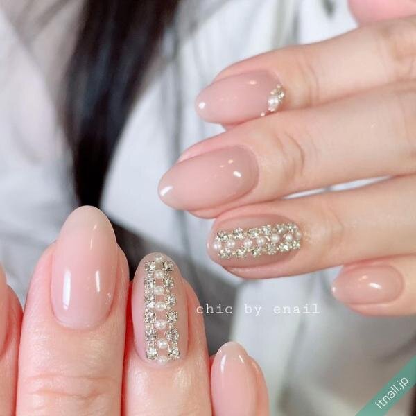 大人女子を魅了する上品なストーンネイル。ベースをピンクベージュにすることで、女性らしい華やぎと清潔感を指先に宿してくれます。真っすぐにストーンを配置することで、指を長く細く見せることができます。パールを真ん中に乗せて、輝きにも微妙に変化をつけて。