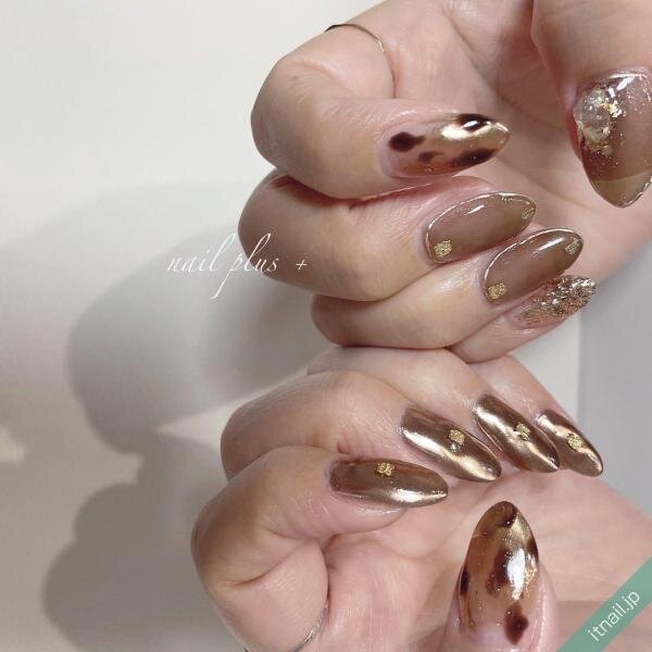 ゴールドミラーを使って、アニマルの模様を描いていくのもおしゃれ♪パッと見ではアニマル柄だと分かりにくいのでチャレンジしやすいです。淡い色をベースにして模様を浮かび上がらせてみて!深みのあるボルドーを挟んで引き締めるとかっこいいです。