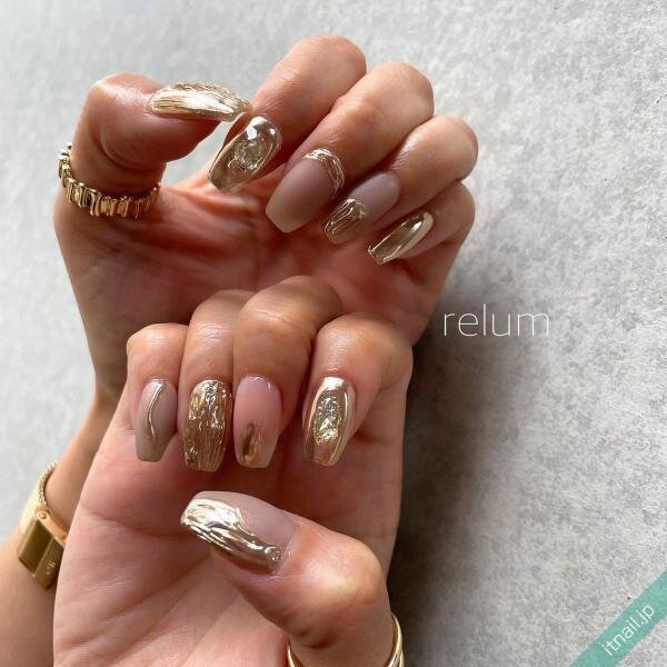 ぷっくりしたミラーアートや、うねうねしたミラーライン、マットネイルにかぶさるように入れたミラーネイルなど、いろんなミラーアートを詰め込んだデザインです。爪ごとにデザインが違うので、見ていて飽きないマットネイルに♡ヌーディーカラーとゴールドでまとめられているのも素敵です。