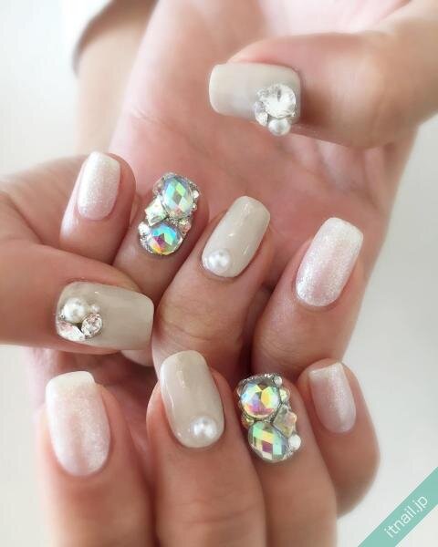 こちらはグレージュのワンカラーに、パールホワイトを組み合わせたデザイン。爪を埋め尽くしたオーロラカラーのビッグストーンがゴージャスですね。さらに左右1本ずつ、大きめパールを使ったビジューを乗せて、インパクトのあるネイルを作り上げています。スクエアな爪の形もスタイリッシュですね。
