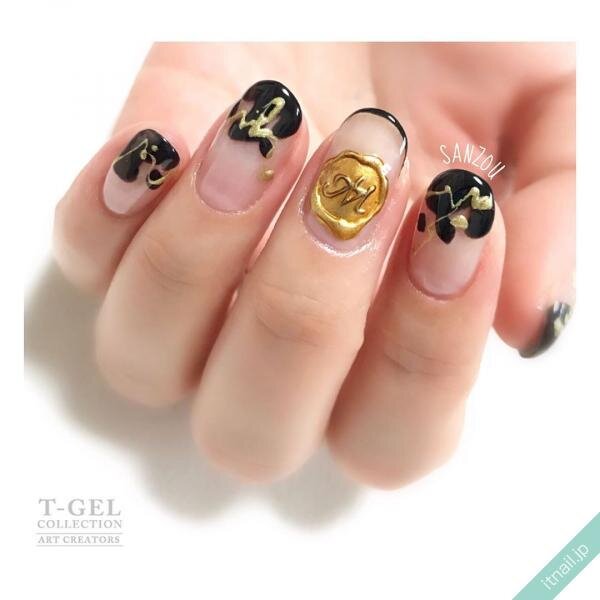 モノトーンの中にあえてゴールドのシーリングスタンプを入れて、地味にさせないモノトーンネイルに。ランダムに引いたフレンチラインが洗練された印象に導いてくれます。普通のモノトーンネイルに飽きた人におすすめのデザインです。