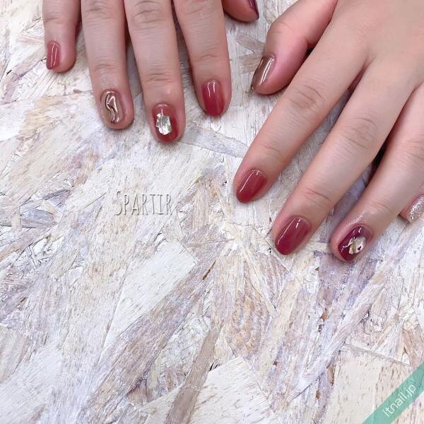 型にとらわれず感性のままにたらりとメタリックジェルを垂らしたような、アーティステックなネイル。シンプルなのに個性が光ります。ベースカラーのクリアボルドーの血色感がくすみがちな手指をパッと明るくしてくれるのも嬉しいポイント。寒くなるにつれ指先もくすみがち・・そんな時にクリアボルドーは救世主になってくれます。