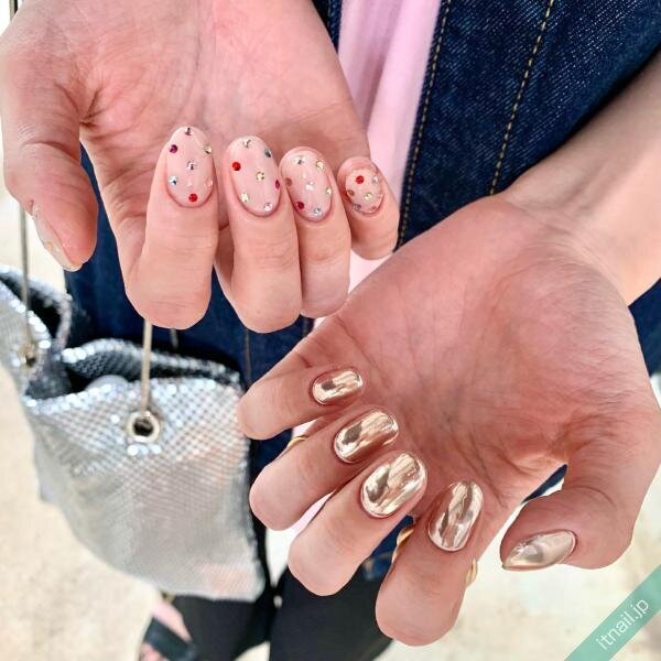 トレンドに敏感な女子の間では、ちぐはぐネイルが人気継続中。冬のニットスタイルに合わせるなら、刺激的なミラーや目を引くようなカラフルビジューを取り入れてみるのもあり。まるでアクセサリーのようなきらめきで、冬コーデを楽しませてくれること間違いなしのネイルデザインです。