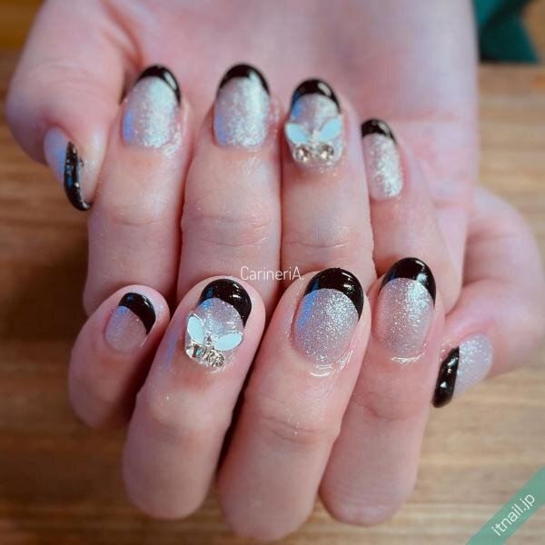 こちらは、シルバーのラメジェルをベースにしたフレンチネイル。ラメの輝きとは正反対の、落ち着いたブラックを先端に入れてコントラストをつけています。左右1本ずつ乗せた、バタフライモチーフがゴージャスですね。パーティーでも注目を集めそうな、個性派デザインですよ。