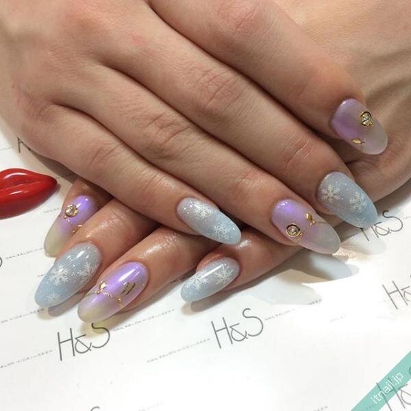 こちらは、パール感のあるペールブルーをメインにしたデザイン。ホワイトの雪の結晶モチーフを散りばめて、このシーズンらしいネイルを作っています。左右数本に、ホワイト×オーロラパープルのグラデーションネイルをプラス。ほんのりした色使いが、幻想的なムードを漂わせていますね。