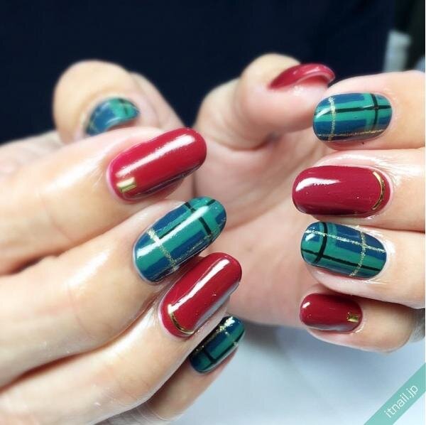 こちらはレッドに、インパクトのあるグリーンのタータンチェック柄を組み合わせたデザイン。はっきりカラーのコントラストが、華やかですね。所々に乗せたゴールドのパーツやラメラインが、大人っぽさを加えています。カジュアルになりすぎず、モード系のファッションにも似合いそうなネイルですよ。