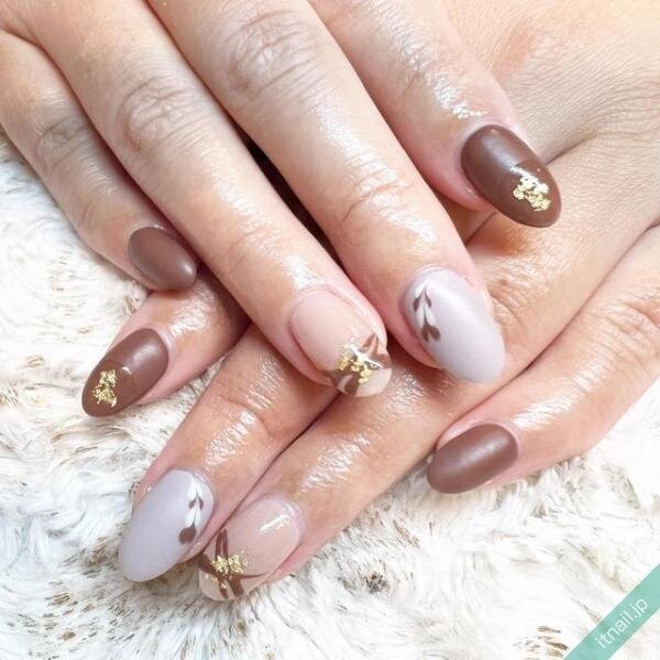 ツヤを抑えたマットなブラウンは、まるで本物のチョコレートのような見た目に。爪先に丸くツヤ加工を入れ、金箔を添えて、質感やきらめきでアレンジを加えていきます!チョコソースでアレンジしたようなピーコック柄や爪先のデザインで、どの指を見てもうっとりする素敵なネイルにします♪