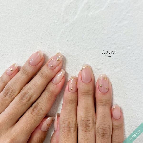 シアーホワイトとスキンベージュをミックスしたような、透明感のあるカラーが可愛いですよね♡ベースがクリアなので、ちゅるんとした艶々な仕上がりに。アートは、フレンチとハートを交互に。ハートは、小ぶりサイズをスタッズと合わせながらON。爪の大きさを見ながら、個数はアレンジしてみて。シルバーのアクセサリーが多い方は、ゴールドからチェンジするのも◎