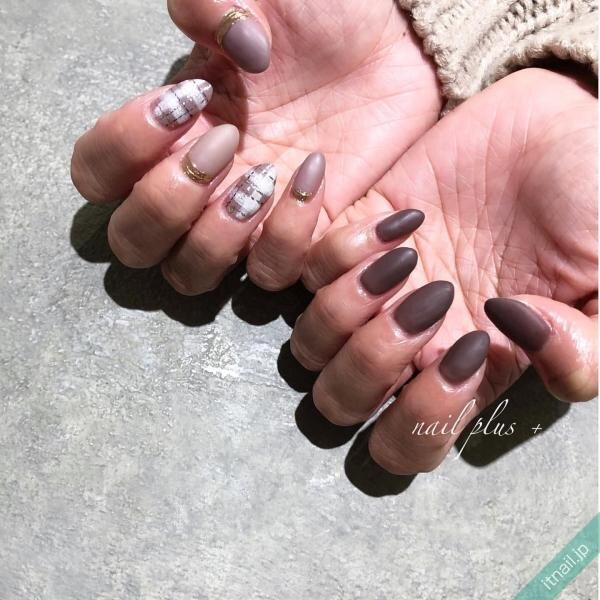グレイッシュな色に、ホワイトラインを重ねたチェック柄は、指先に馴染むキレイめデザイン♡ゴールドミラーを飾ることで、より上品な大人ネイルになります。もう片方は、ダークなブラウンのマットネイルでまとめるとおしゃれですよ!