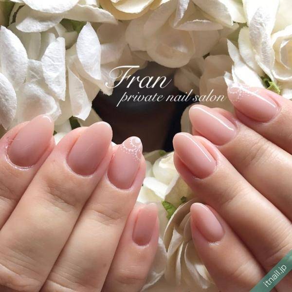 先端だけにレース柄を描くと、優美な印象になります。ベージュやピンクのヌーディーカラーで塗った上に、白でレース柄を描きましょう。フレンチネイルのように、先端に描くのがポイント。