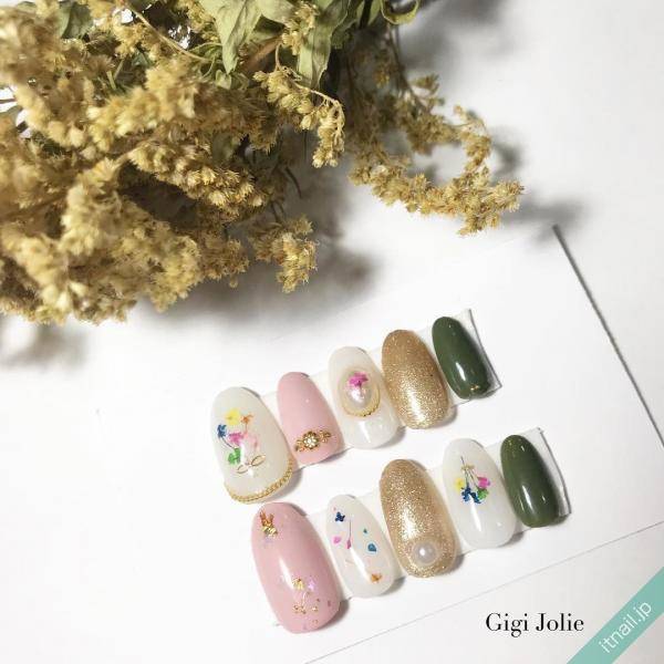 小さく可愛らしいドライフラワーのカラーをトレンドカラーにすることで、しっかりとネイルにトレンドカラーを入れつつも、しつこくなりすぎないよう仕上げることができます。
