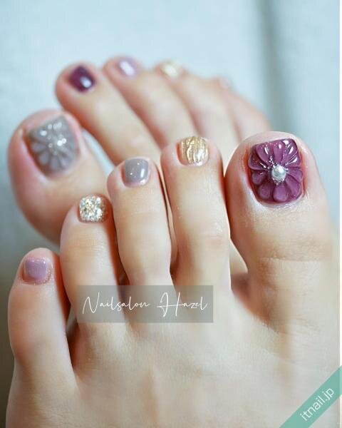 フットネイルは、ハンドネイルよりも見えにくいので、普段はチャレンジできないデザインや色の組み合わせを楽しめるのも魅力です。濃いめのパープルも、フットネイルでなら楽しみやすいですね♡大人っぽさはもちろん、ミステリアスな雰囲気も纏えます。