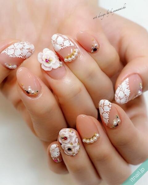 まるで本物のようなリアルなフラワーレースをあしらった、華やかで上品なネイルデザイン。ベースがナチュラルなので、ホワイトのレースの色がよく映えます。3Dのフラワーモチーフや、ネックレスみたいに連ねたパールの装飾など、レースに似合う華やかパーツを組み合わせて。