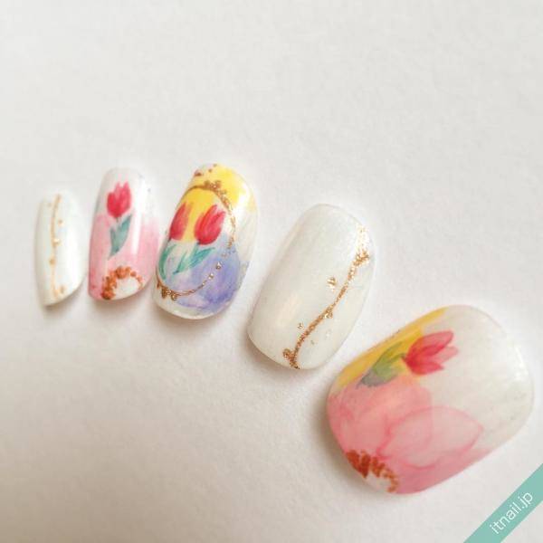 チューリップをネイルアートにするときに、水彩画や色鉛筆アートのように優しいタッチで描くと、とても女性らしい雰囲気になります。まずは、白のベースに黄色や青、ピンクを使って水彩画風フラワーアートを描いてみて。次に、上から赤のチューリップを描けば、まるで絵本の挿絵のような温かみのあるアートになるでしょう。