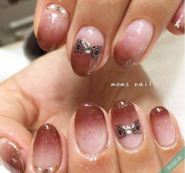 例えば、ブラウンをはじめとするアンティークカラーでアートしたグラデーションネイルをベースデザインとして、そこにリボンモチーフを描くデザインはいかがでしょうか。リボンの柄は、無地でシンプルなデザインにしてもいいですし、アラベスク柄やドット柄、レース柄というようにお好みのデザインにしてもいいでしょう。
