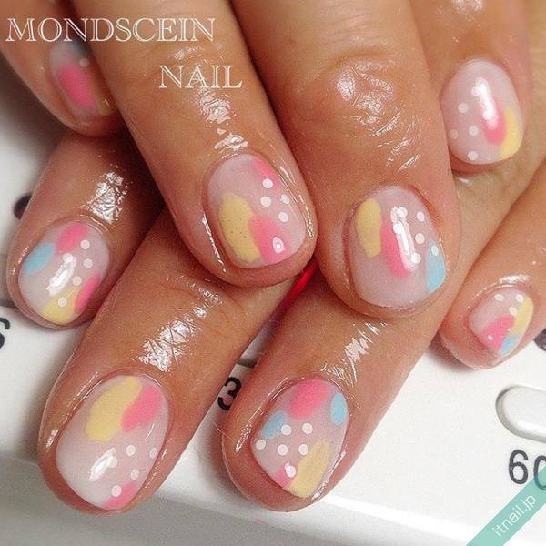 例えば、ピンクやイエローといった春色数種類で爪をランダムにカラーリングし、その一部分にピンドットアートをプラスするデザインはいかがでしょうか。ホワイトのピンドット柄をアートして可愛い感じに仕上げたり、メタリックカラーのピンドット柄をアートして大人カッコいい感じに仕上げたり…といったアレンジもおすすめですよ♪