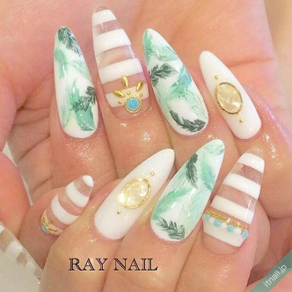 例えば、ホワイトのワンカラーとクリア×ホワイトのボーダー柄の組み合わせは、非常に涼しげです。数本だけグリーンの葉っぱアートを大胆に描きましょう。見ているだけで爽やかな気分になれそうですね。