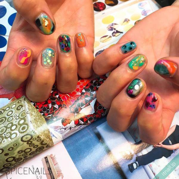 また、重なり合わせるようにカラフルなドット柄をアートするデザインもおすすめです。5本全ての爪を油絵風のデザインにしてもいいですし、爪2本くらいを油絵風ネイルに、残りの爪はアートに使った色を使ったワンカラーネイルに、といったデザインにしても良いでしょう。
