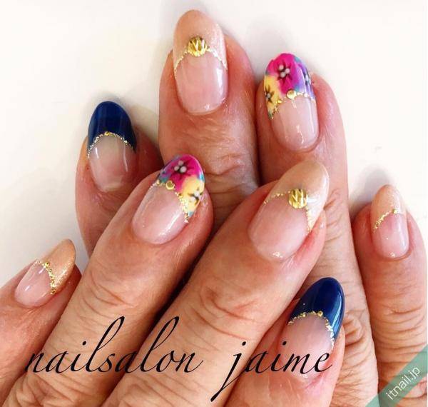 エレガントなデザインが好きなら、フラワーフレンチと組み合わせても美しいです。甘いイメージのフラワーフレンチも、ネイビーフレンチが数本入ることによってシックにきまります。フレンチすべてをピンクやベージュで揃えるよりも、スパイスが効いて大人っぽいデザインになりますよね。