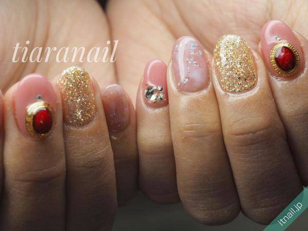 ころんとしたフォルムが可愛らしいショートカットにピンクとゴールドグリッターの組み合わせ。グリッターは粒子が粗めで、圧倒的な存在感を放っています。ルビー色のブローチ風のモチーフを飾り付けて、とても贅沢感のあるきらめきネイルです。