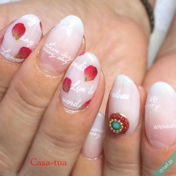 英字をベースにして、その上に花びらを描いてもOKです。ベースの色はホワイトで、英字もホワイトにすれば、赤の花びらがとても引き立ちます。