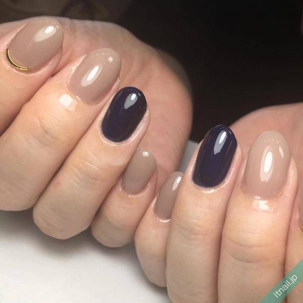 肌色に近いベージュと、それとは対照的な濃い色味のネイビー。これらを組み合わせたネイルは、ベージュをベースとしたシンプルなネイルを基本のデザインに、爪1本だけにネイビーを取り入れる形でアートするのもおすすめです。