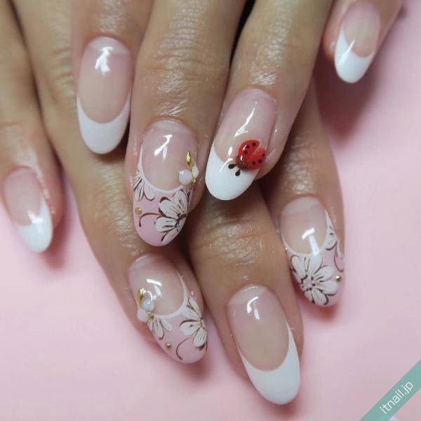 春夏らしく、フラワーフレンチとてんとう虫を組み合わせるのもおすすめです。まるで、花畑の中にてんとう虫がいるようなアートになりますよ。花の種類は、マーガレットでもチューリップでも、あなたの好きな花で大丈夫ですよ。