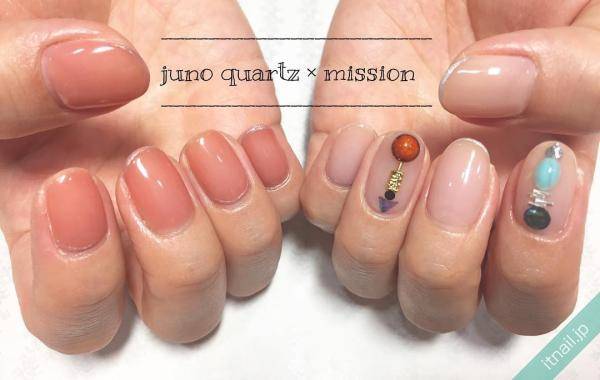 例えば、片方の爪は大きめの天然石を大胆にあしらったカジュアルネイルに、もう一方の爪は鮮やかな色味のワンカラーネイルに、といったデザインはいかがでしょうか。左右とも上品カラーのワンカラーネイルを基本としつつ、片方の爪だけに天然石をプラスするデザインも素敵ですね。