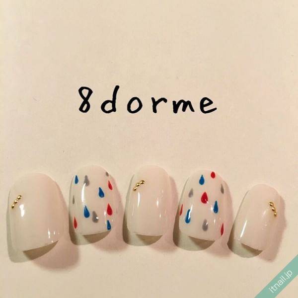 白のワンカラーで全部の爪を塗った後に、数本だけ青、赤、グレーでしずくを描きましょう。ドット柄を描くように、小さめにいくつか描くとキュートです。ゴールドのブリオンを乗せてもアクセントになりますよ。