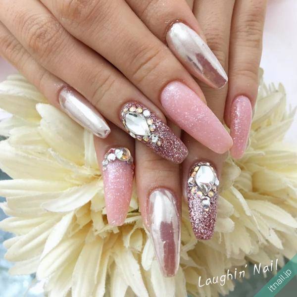 ギャル系の女性なら、ロングネイルにミラー×ラメネイルを組み合わせるとGOODです。ピンクのミラーネイルとピンクのラメ埋めつくしで、とことん女の子っぽさを追求しましょう。キラキラ感をプラスしたい人は、根元にストーンをデコ盛りしても存在感が増します。