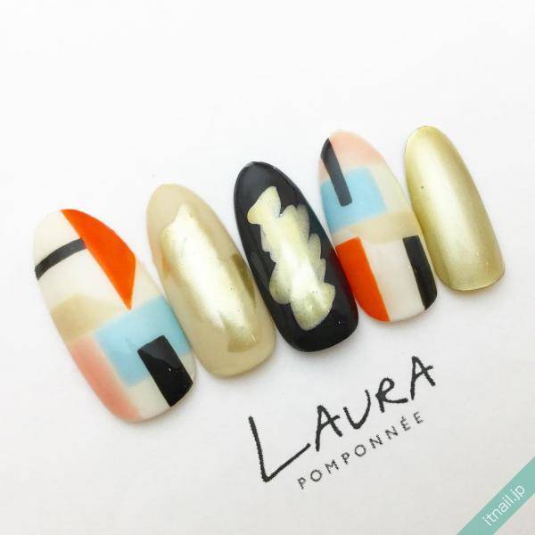 ブロッキングも、三角や四角を組み合わせてランダムにするとアート性が増しますよ。ほかの爪はゴールドやブラックを使ってニュアンスアートに。まるで現代アートのように描かれたネイルは、どこから見てもアーティスティックです。ぜひモード系のファッションと合わせて、トータルコーディネートを楽しんでみてくださいね。