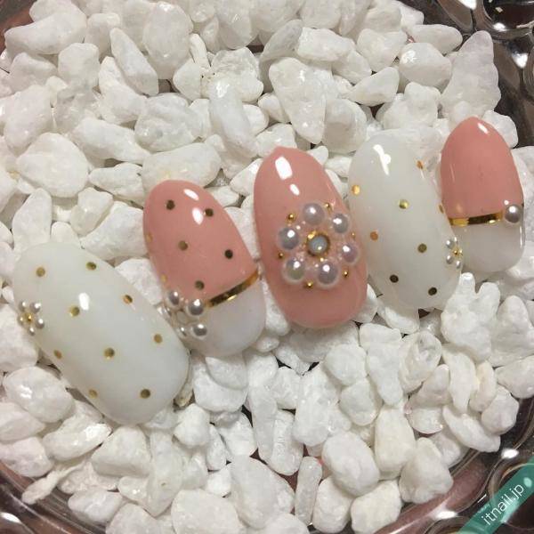 ホワイトネイルとピンクベージュネイルに、パールを並べて作ったフラワーネイル。大粒のパールから小粒のパールまでと大きさを変えて、ランダムに置かれた大小のフラワーがとってもキュート。大人可愛いデザインです。