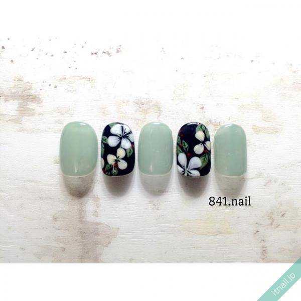 カーキのネイルと、ネイビーをベースにホワイトフラワーが可憐なネイル。春の爽やかな気候にピッタリのカラーコンビネーションです。周りからも素敵なネイルだねと褒められてしまうこと間違いなしのデザインです。