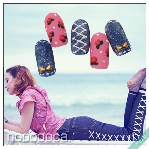 例えば、ベースをデニムデザインにして、その上に編み上げ模様を描いていく、というのはいかがでしょうか。シンプルなデニムネイルが、編み上げ模様をプラスするだけでスニーカーのようなデザインに変化します。