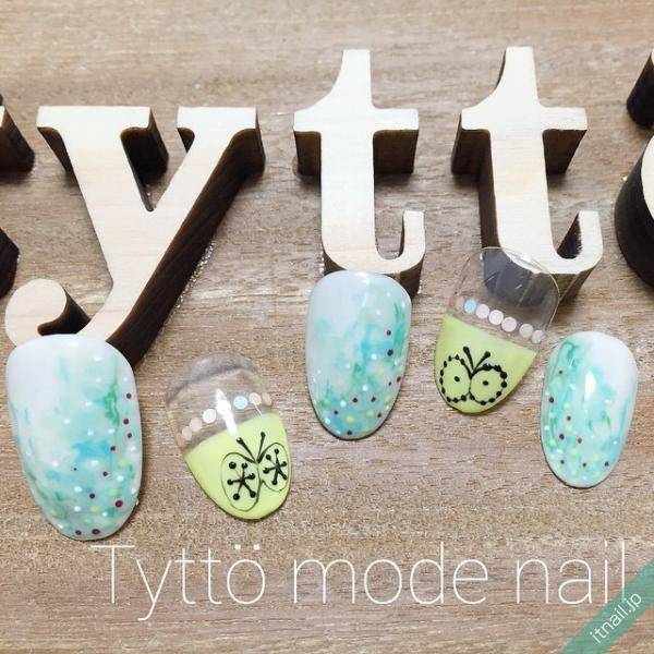 ストレートフレンチは、ミントカラーを用いてあります。ポップなチョウチョを描いて、可愛さUP!チョウチョの羽根に、目が惹かれてしまいますす。