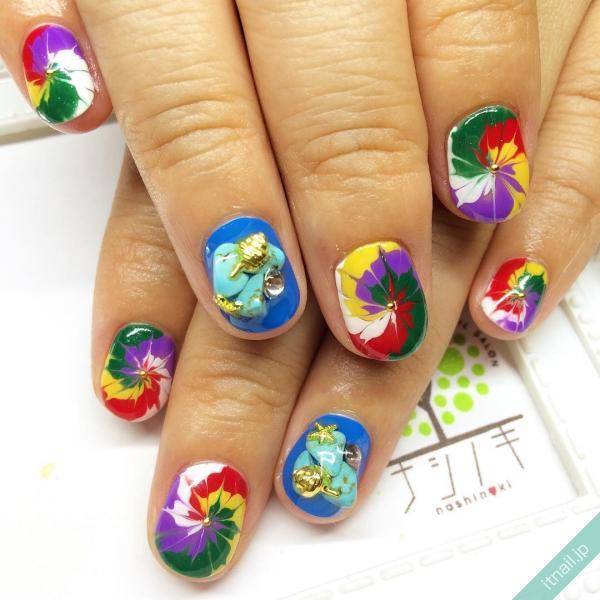 ヒッピーファッションで大流行だったレインボーカラー。思い切り派手なカラーを使ったピーコックデザインがおすすめです。ピーコックとはクジャクの羽をイメージしたデザインで、華やかさのあるネイルデザインです。