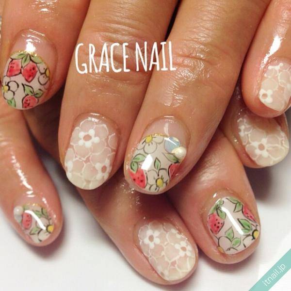 例えば、苺柄とフラワー柄を組み合わせるのはいかがでしょうか。お花畑の中に苺が生えているようなイメージのアートをしたり、フラワー柄レースと苺柄を組み合わせたり…。アイデア次第でいろいろな苺ネイルを楽しめそうですね。