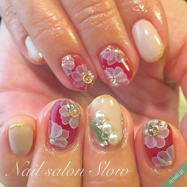 お花モチーフはネイルでは定番のデザインですが、オーガンジーフラワーにするだけで季節感を楽しんだり、いつもとちょっと違ったテイストが楽しめます。