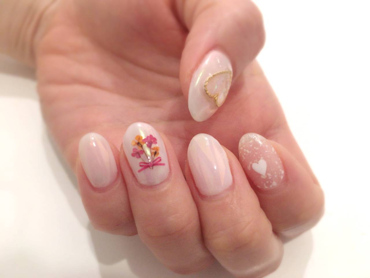 オーロラフィルムを使った透け感デザインに甘さを足すならば、ぜひ小花でブーケ風デザインを入れてみてください。